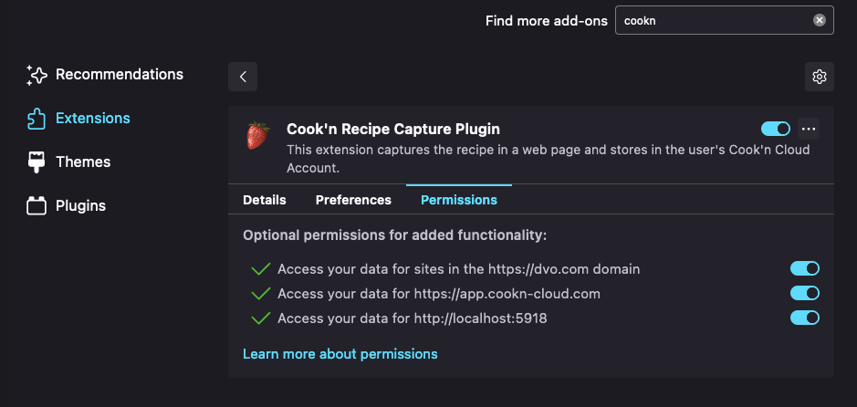 This is happening due to a change made by Firefox to enhance privacy. Fortunately, the solution is simple. To fix this, simply click to the Permissions tab for the Cook'n Recipe Capture Plugin and click the toggle to enable the permissions as illustrated in the following screenshot: